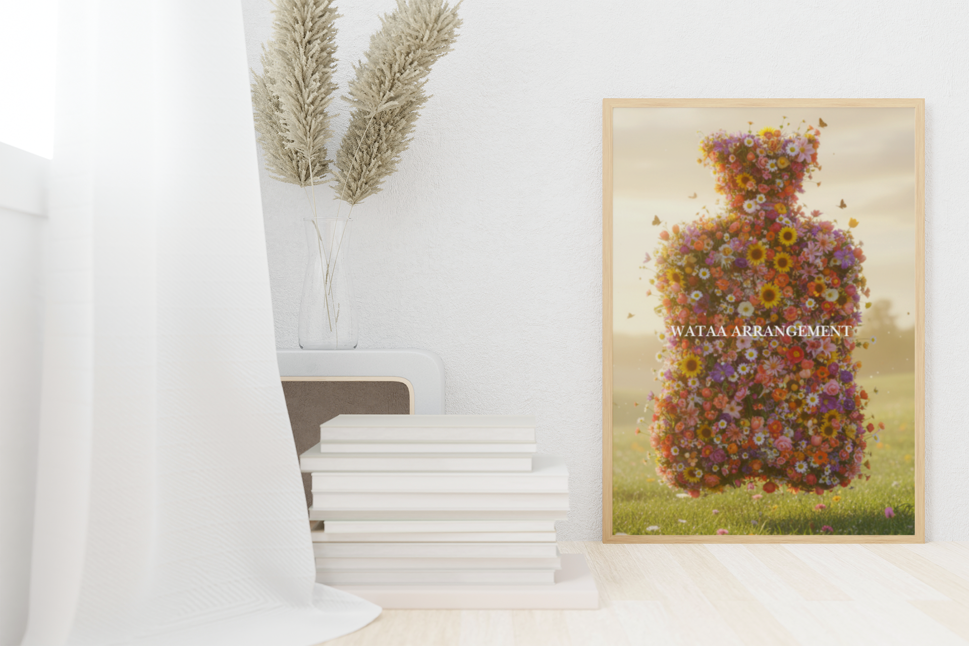 A bloom in perfect balance. Each petal gathers to form the timeless WATAA silhouette, rising from the meadow as if nature herself sculpted it. Sunlight glows through the blossoms, butterflies dance around its edges, and the air hums with quiet harmony. It’s not just a bouquet — it’s the living shape of beauty, growth, and grace.